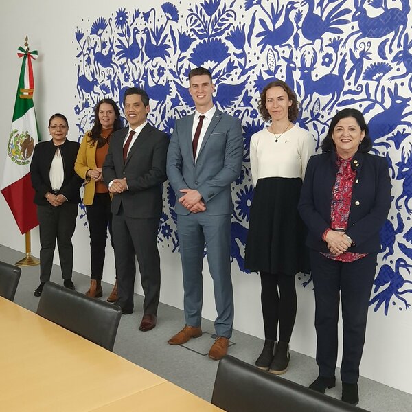 Anschließend nahmen Dr. de Melo-Reiners und die beiden ReferentInnen einen Termin in der Botschaft von Mexiko wahr. Dort wurden sie vom Botschafter S.E. Francisco José Quiroga Fernández, Wissenschaftsattachée Dr. Julieta Rojo Medina und Laura E. García Querol, Leiterin der technischen und akademischen Zusammenarbeit, empfangen. Zunächst wurde dem neuen Botschafter BAYLAT als Institution mit seinen Aktivitäten und dem Forschungs- und Kooperationsnetzwerk Lateinamerika in Bayern (LATinBAY) vorgestellt, bevor sich die BAYLAT-VertreterInnen mit den Botschaftsangehörigen über aktuelle Themen und Anknüpfungspunkte der bayerisch-mexikanischen Wissenschaftskooperation wie die Hightech Agenda Bayern austauschten. Außerdem sammelten die GesprächsteilnehmerInnen erste Ideen für eine Neuauflage des bereits 2019 durchgeführten Mexikotages in Bayern.