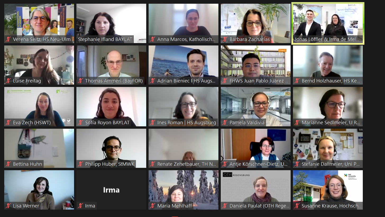 Am Mittwoch, den 12. Januar 2022, organisierte das Bayerische Hochschulzentrum für Lateinamerika (BAYLAT) ein virtuelles Informationstreffen für die International Offices aller bayerischen Hochschulen. Seitens BAYLAT nahmen Dr. Irma de Melo-Reiners, BAYLAT-Geschäftsführerin, Jonas Löffler, BAYLAT-Referent und Marketingbeauftragter, Stephanie Ifland, BAYLAT-Koordinatorin und Assistenz der Geschäftsführung, und Sofía Royon, BAYLAT-Mitarbeiterin für Finanzen, Verwaltung und Veranstaltungen, an der virtuellen Veranstaltung teil.
