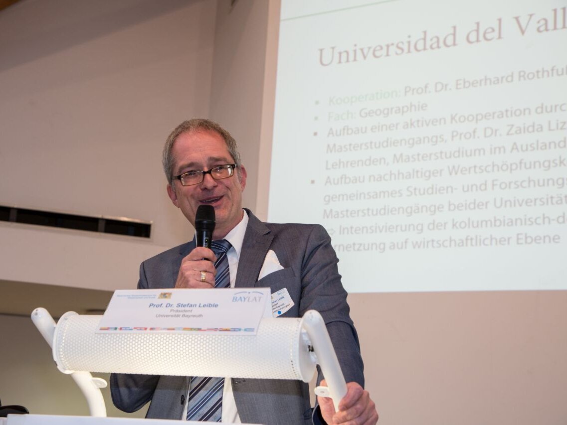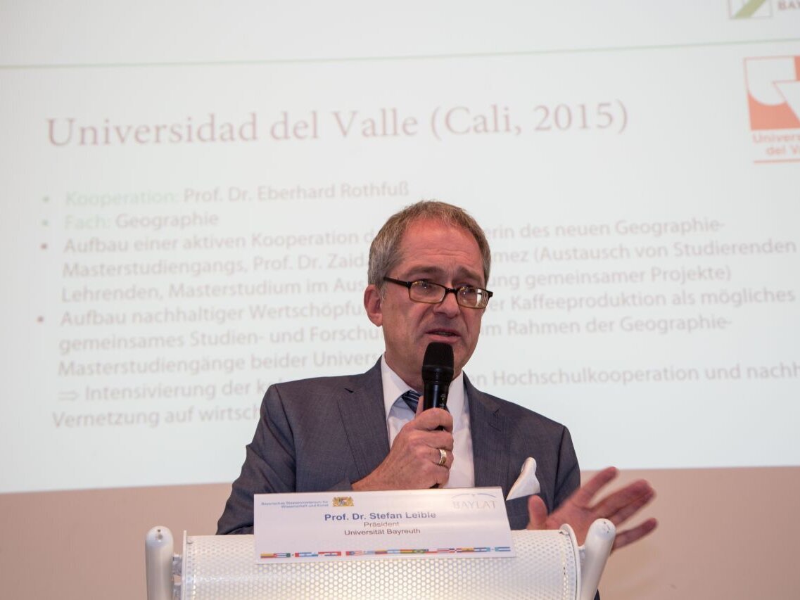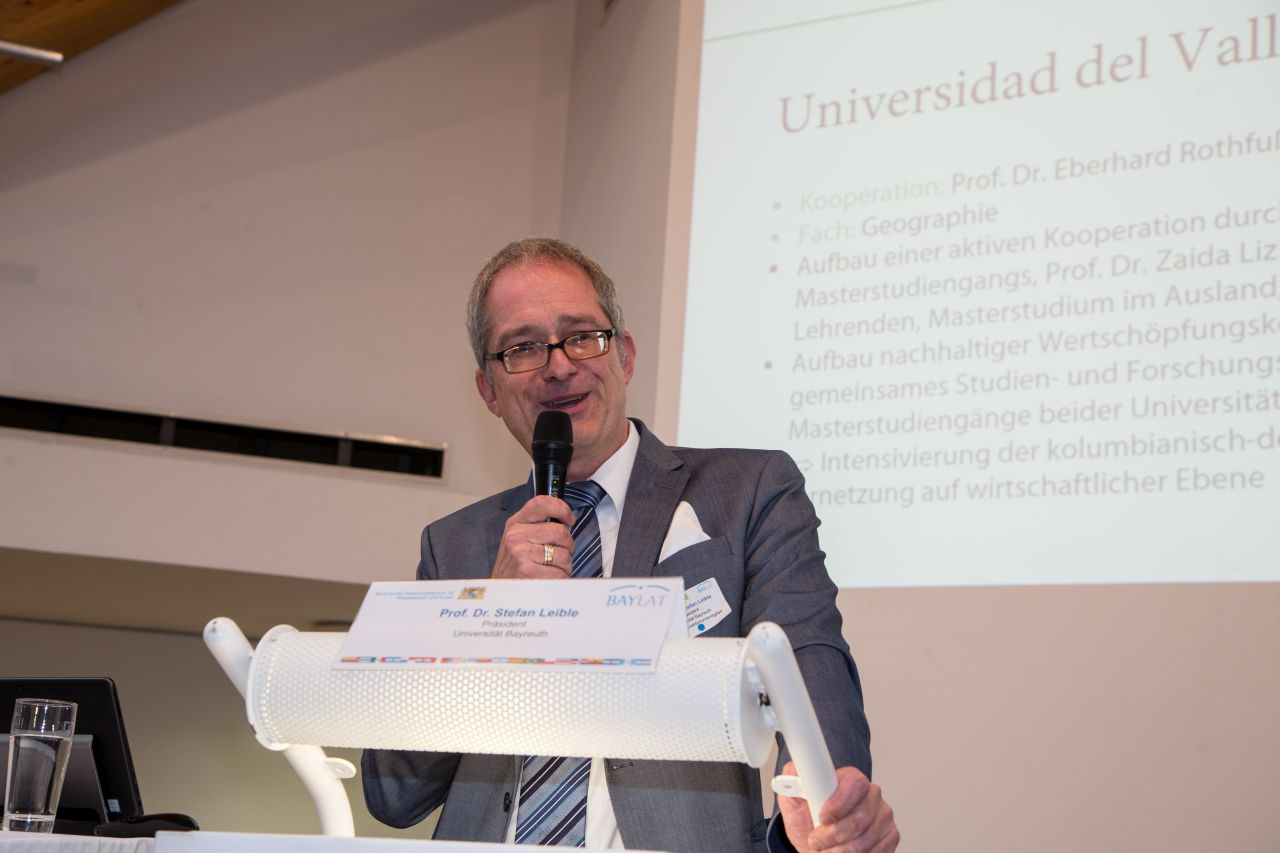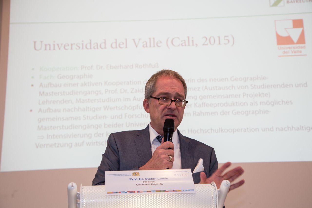 Der Vortrag von Prof. Dr. Stefan Leible, Präsident der Universität Bayreuth und BAYLAT-Direktoriumsmitglied, zeigte wie es gelingen kann, die Internationalisierung der Forschung mit Lateinamerika durch die Unterstützung der Universitätsleitung zu fördern und nachhaltig zu implementieren. Prof. Dr. Pagni meint hierzu: „Das Beispiel der Universität Bayreuth zeigt, wie man unter Berücksichtigung eines anderen, bereits etablierten Profils, in diesem Fall die Afrika-Studien, ein Lateinamerika-zentriertes, innovatives Forschungskonzept entwickeln kann.“