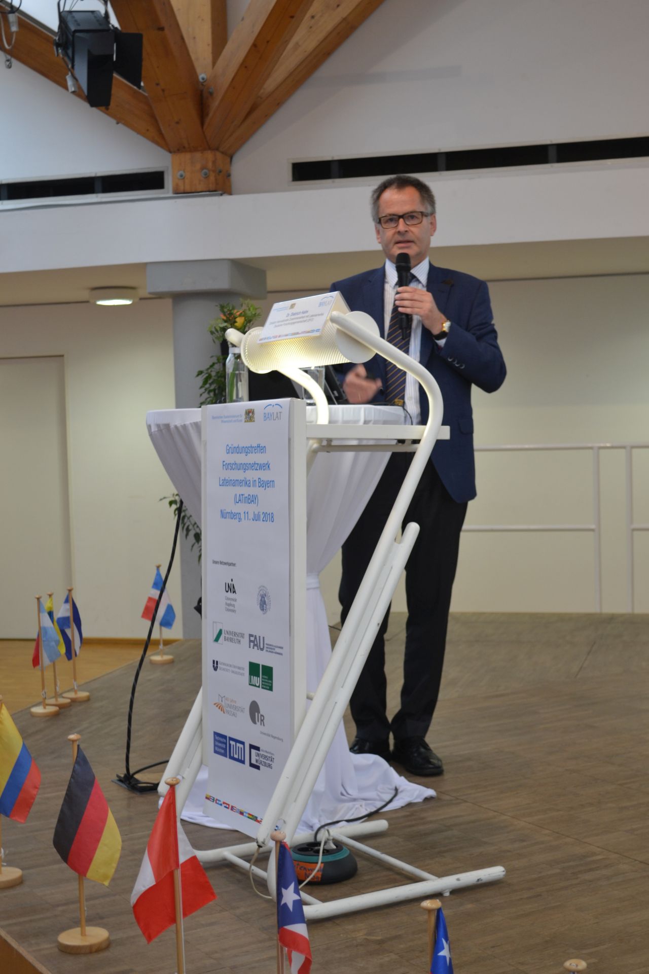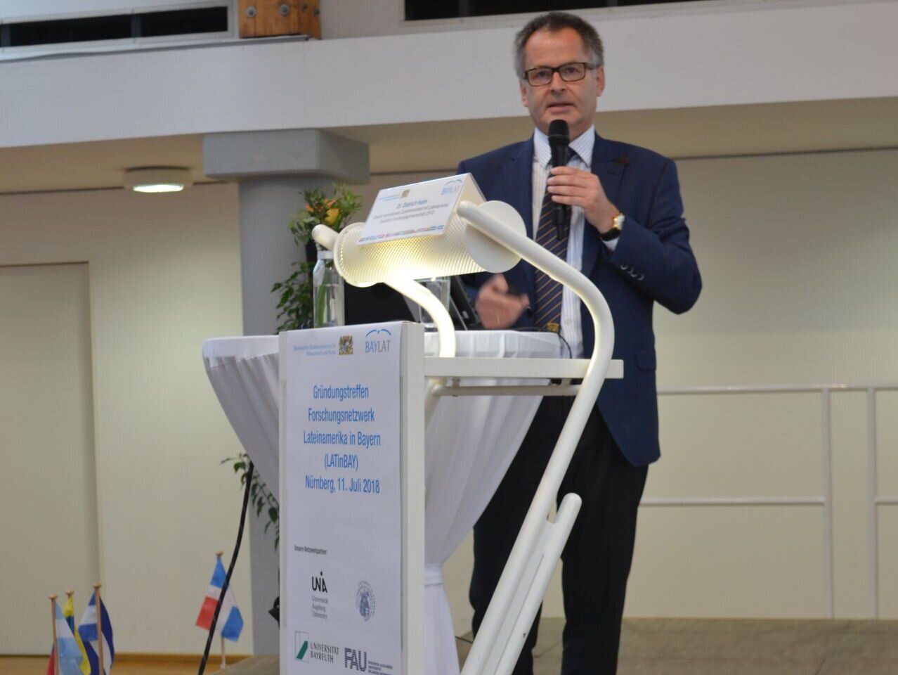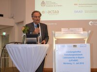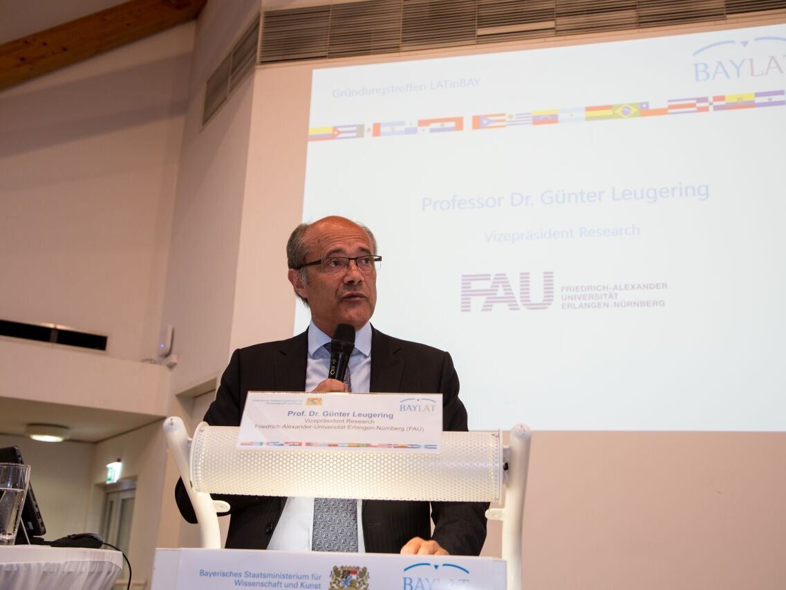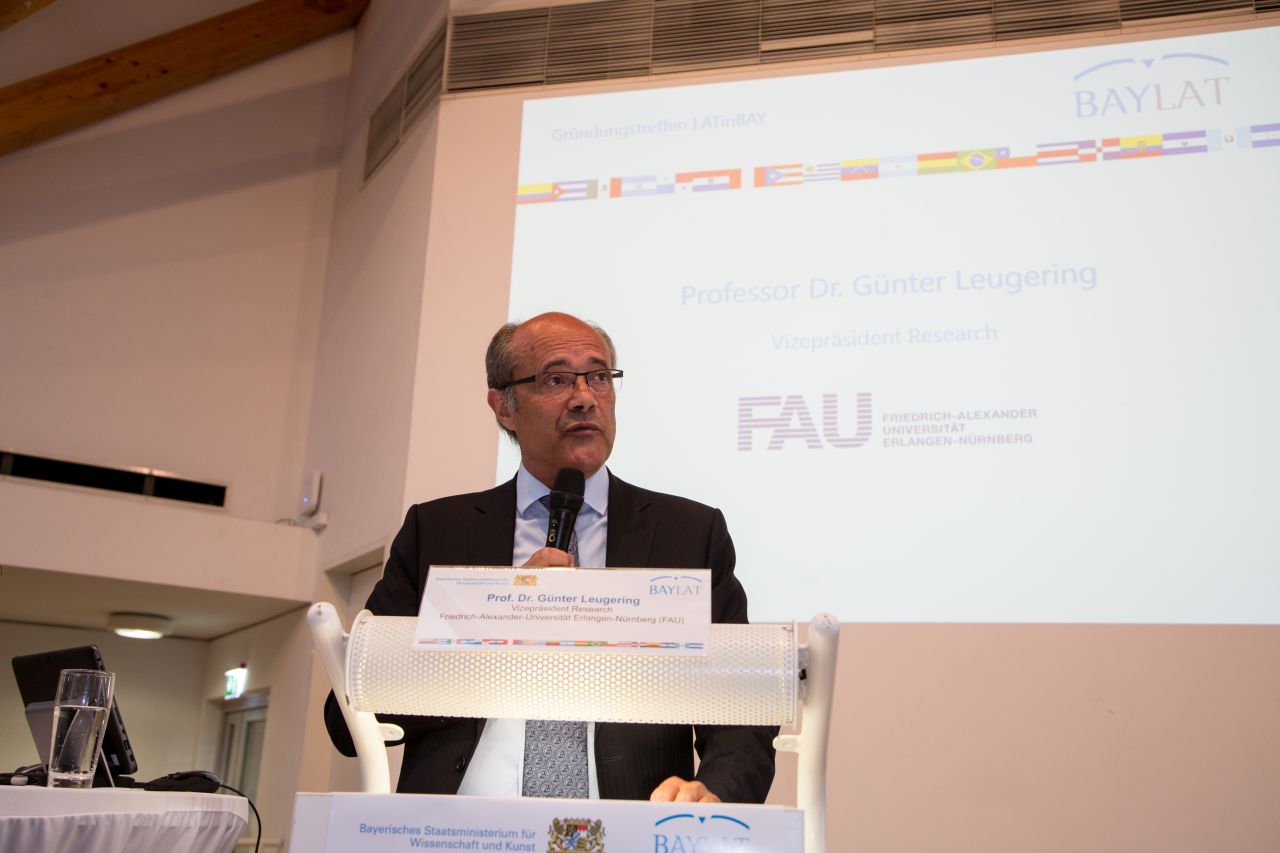 Gastgeber der Veranstaltung war Vizepräsident Research Prof. Dr. Günter Leugering, der in seinem Grußwort betonte, welch ein Glücksfall es für die Friedrich-Alexander-Universität Erlangen-Nürnberg (FAU) sowie die Europäische Metropolregion Nürnberg war, dass 2007 entschieden wurde, BAYLAT an der FAU zu etablieren. In seiner Ansprache lobte er die Arbeit von BAYLAT und sicherte die Unterstützung der FAU für das Forschungsnetzwerk zu.