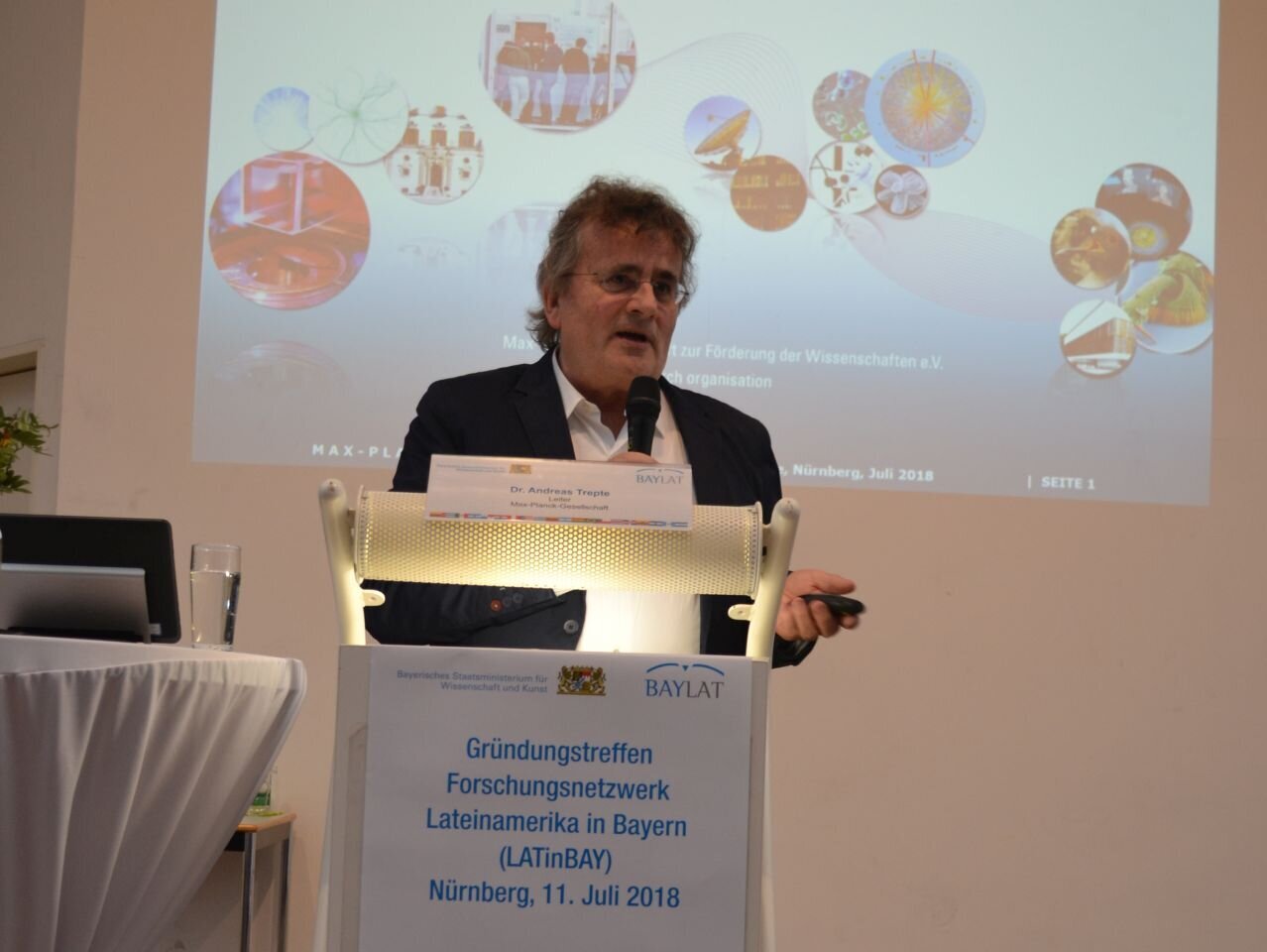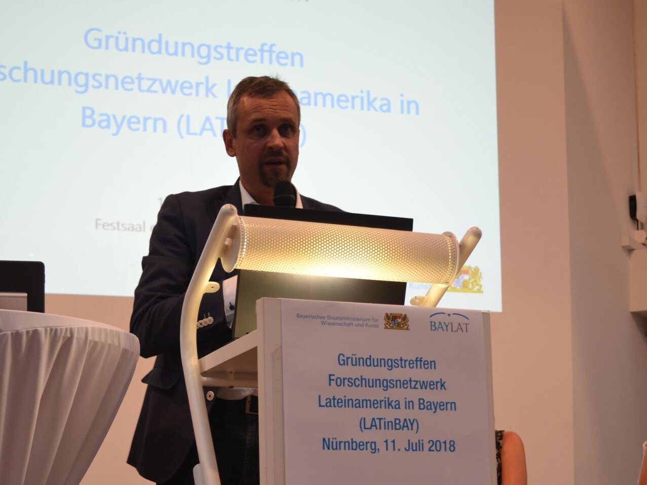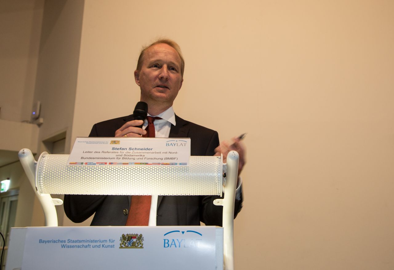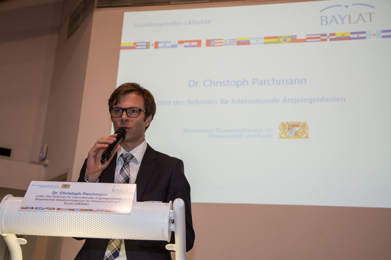 Dr. Christoph Parchmann schloss sich seinem Vorredner an und unterstützt in seiner Funktion als Leiter des Referats für Internationale Angelegenheiten des Bayerischen Staatsministeriums für Wissenschaft und Kunst (StMWK) ausdrücklich die Gründung des Forschungsnetzwerkes. Diese BAYLAT-Initiative wurde laut Dr. Parchmann höchst positiv im bayerischen Wissenschaftsministerium aufgenommen. Besonders lobend stellte er die Idee eines Forschungsinformationssystems heraus, welches die Mitglieder des Netzwerkes zukünftig dauerhaft und fachübergreifend vernetzen soll.