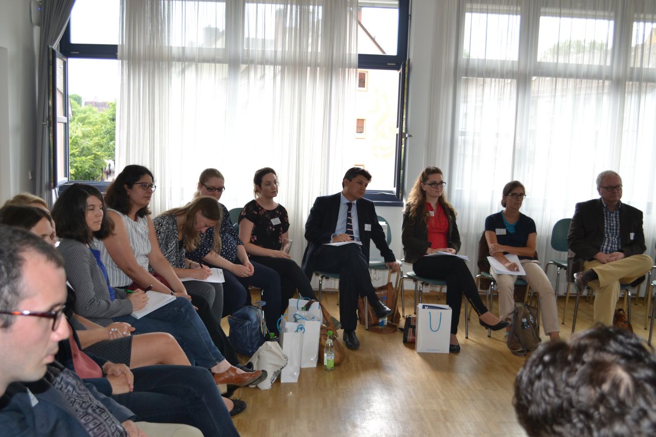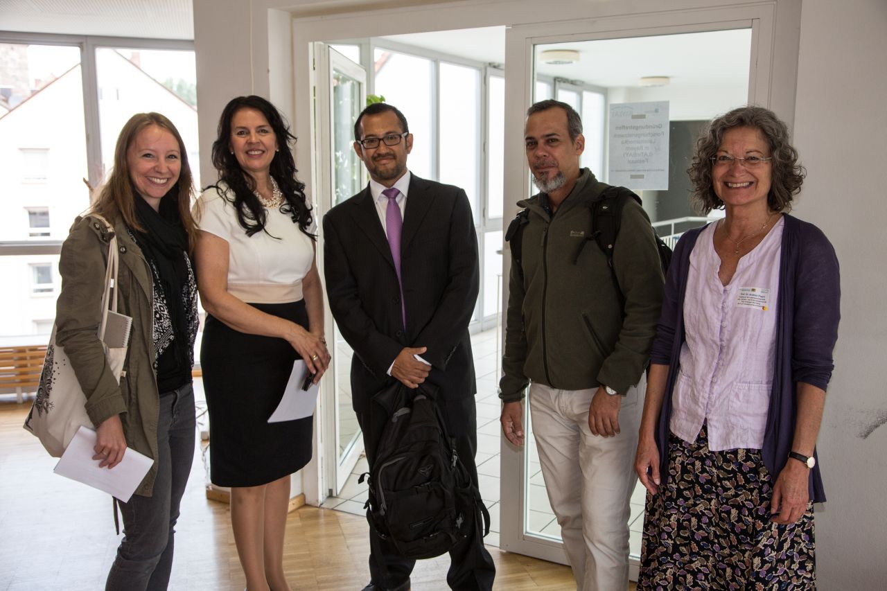 Der Nachmittag stand dann ganz im Zeichen der Förderinstitutionen. Der DFG, der DAAD und das DAHZ stellten in präzisen Präsentationen ihre Fördermöglichkeiten in der Zusammenarbeit mit Lateinamerika da. Dr. Dietrich Halm, DFG-Direktor für internationale Zusammenarbeit mit Lateinamerika, Christine Arndt, DAAD-Koordinatorin für Regionalwissen Westeuropa I Nord-, Mittel- und Südamerika und BAYLAT-Beiratsmitglied sowie Daniel Zimmermann, DAHZ-Direktor, waren extra für das Gründungstreffen aus Bonn nach Nürnberg gereist und standen auch im Nachgang zu ihren Vorträgen für direkte Gespräche mit den Mitgliedern des Forschungsnetzwerkes zur Verfügung.