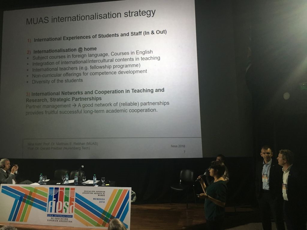 • „Der Beitrag von internationalen und englischsprachigen Studiengängen für die Ziele der Internationalisierung“ – ReferentInnen: Nina Kohr, Prof. Dr. Gerald Preißler und Prof. Dr. Matthias Rebhan. Sie sprachen zu dem Thema: „Der Beitrag von internationalen und englischsprachigen Studiengängen für die Ziele der Internationalisierung“. In diesem Panel stellten u.a. auch Hochschulen aus Argentinien, Brasilien und Uruguay ihre hausinternen Internationalisierungskonzepte vor.